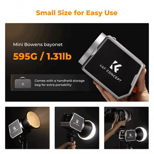 اندازه کوچک و قابل حمل: در تجهیزات نورپردازی کی اند اف این چراغ با ابعاد 12×8.3×7.2 سانتی متر و وزن تنها 595 گرم، همراه مناسبی برای عکاسی سیار است. کیف دستی همراه نیز امکان حمل آسان تمام لوازم جانبی را فراهم می کند.